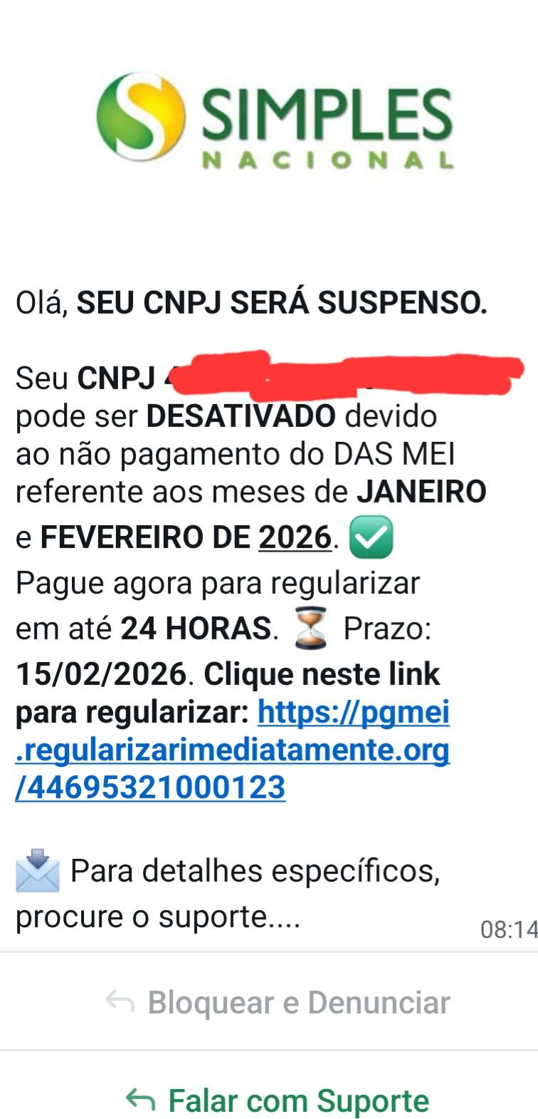 Na mensagem os golpistas enviaram o CNPJ da vítima dizendo que ela estava com o DAS SIMPLES NACIONAL de janeiro e fevereiro de 2026, com valores devendo e isso é algo que não procede.