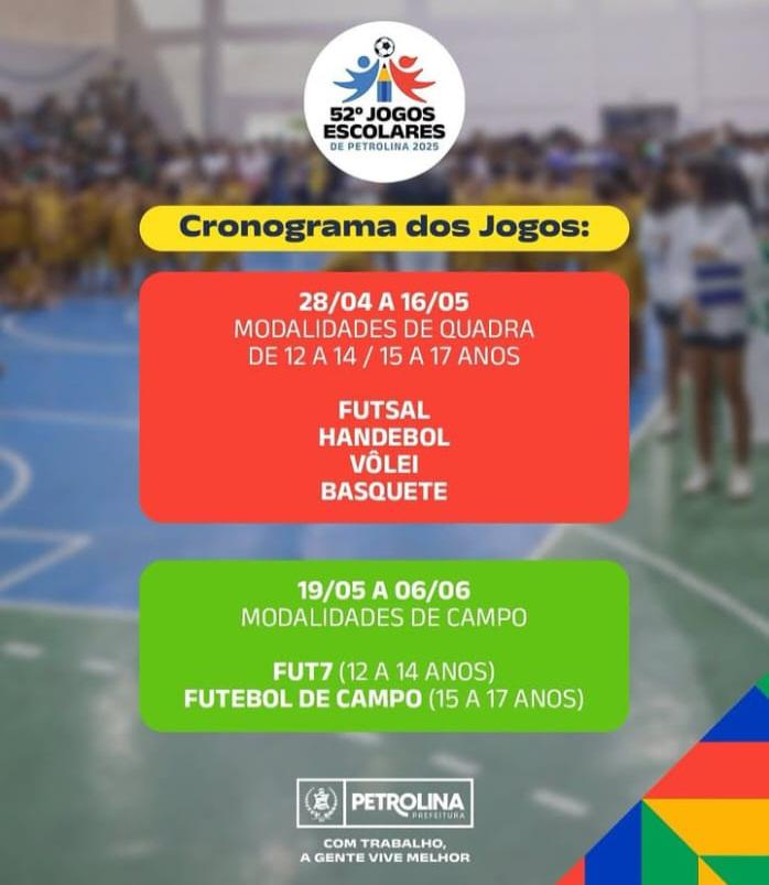 As escolas devem escolher as modalidades e inscrever suas equipes através do site: www.edu.petrolina.g12.br até 07 de abril. Veja abaixo o cronograma das modalidades: